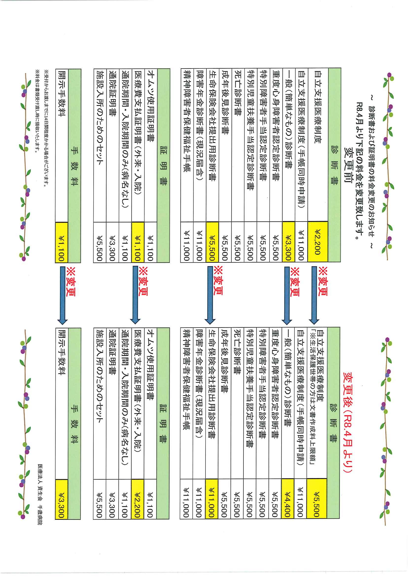 診断書および証明書の料金変更のお知らせ(R8.4.1~)