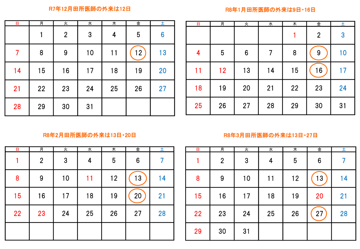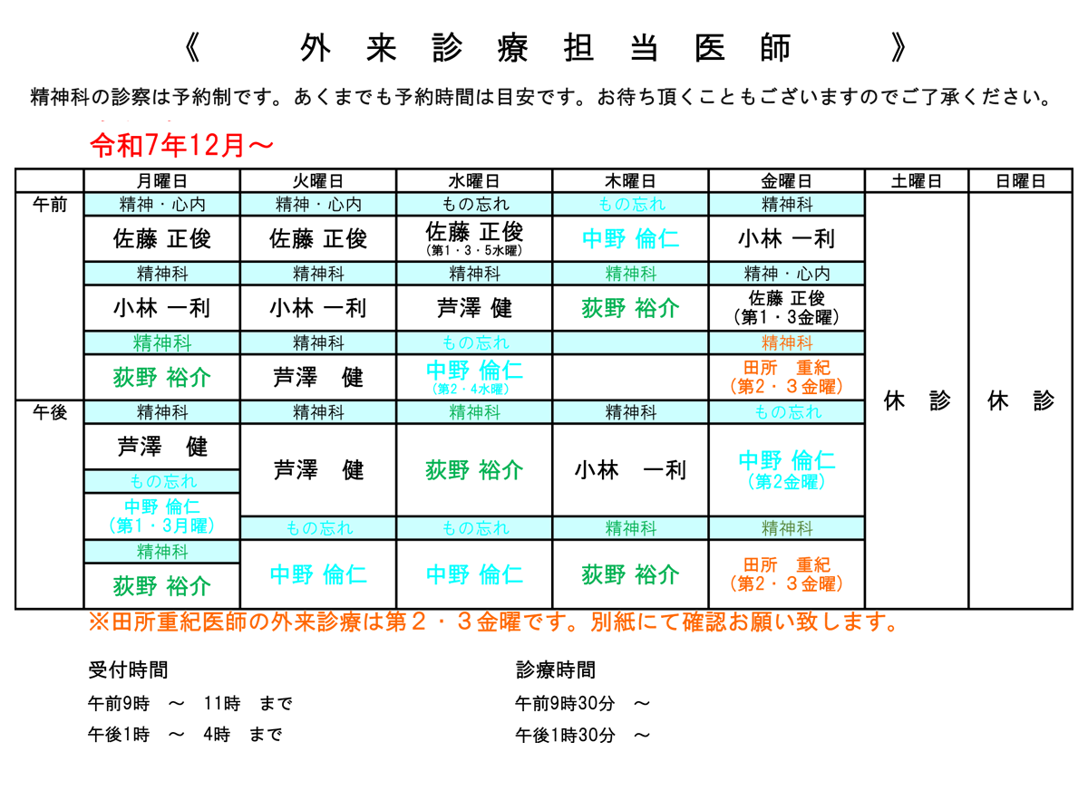中野先生のもの忘れ外来は月によって異なります。詳細はお電話でお問い合わせください。