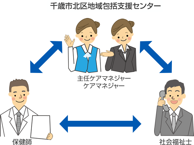 千歳市北区地域包括支援センターではおおむね65歳以上の方、及びその方を介護されている方を対象に主任ケアマネジャー、社会福祉士、保健師などが中心となり、お互いに連携を取りながら「チーム」として総合的に支援を行います。